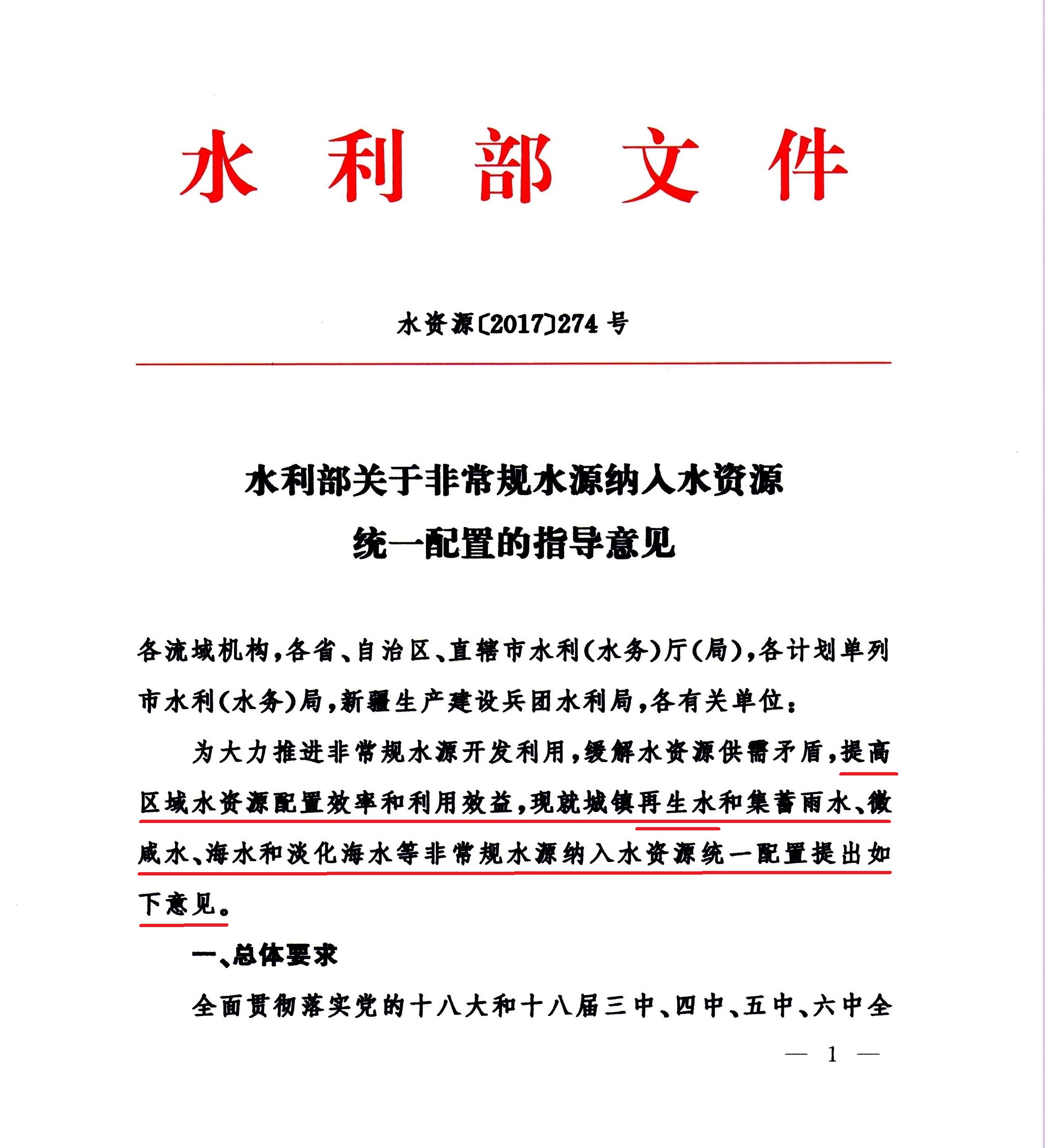 《水利部關于非常規水源納入水資源統一配置指導意見》