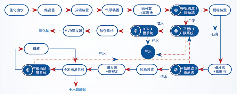 該工藝鏈包括磁絮凝預處理、高密池預處理、DTRO、平板納濾、脫穩等系統。實踐證明,基于DTRO為核心技術的煤化工廢水處理工藝具有顯著的技術優勢,可以最大程度高倍濃縮,減少蒸發處理量,進而降低蒸發投資成本和整體運行成本,實現鹽的分離再生。同時,DTRO具有抗污堵、耐高壓等優勢,能夠保障設備長時間高效運行,真正實現煤化工廢水低成本零排放處理。