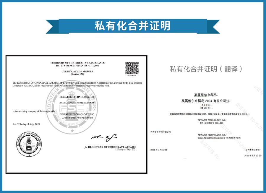 2021年7月12日,買方團于BVI政府監管部門完成對 NEWATER TECHNOLOGY, INC.的合并備案。