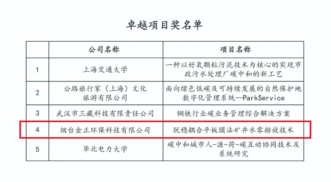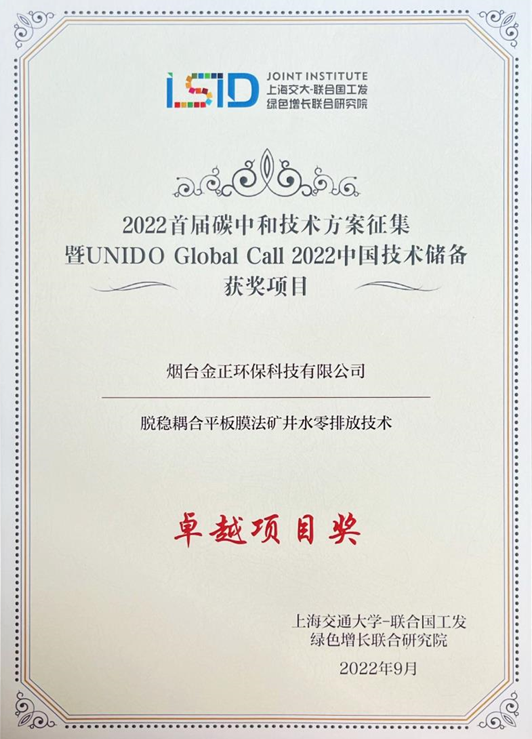 煙臺金正環保憑借環保水處理行業脫穩耦合平板膜法礦井水零排放技術榮獲卓越項目獎,也是山東省唯一獲此獎項的單位。