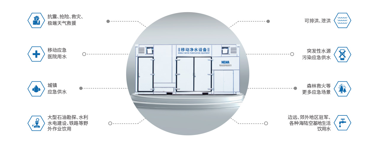當(dāng)自然災(zāi)害及突發(fā)性水源污染事故發(fā)生時,需要一種能夠應(yīng)付不同水源的移動應(yīng)急凈水設(shè)備,滿足救援人員、受災(zāi)群眾和居民基本的用水需求。當(dāng)前,應(yīng)急救援對基本飲用水的保障措施通常為傳統(tǒng)工藝組裝的凈水車、瓶裝水運輸?shù)确绞剑芗夹g(shù)限制、天氣路況等因素影響,不能安全、及時、連續(xù)的滿足飲用水供應(yīng)需求。因此,提供可移動式應(yīng)急所需、戰(zhàn)事所需、生活所需的移動凈水設(shè)備受到離度重視。